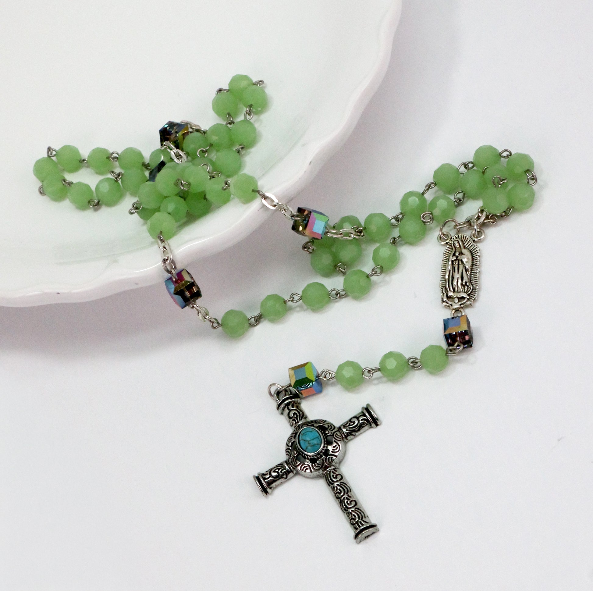 Ginette Reno - Chapelet avec billes verte, croix ornée 393